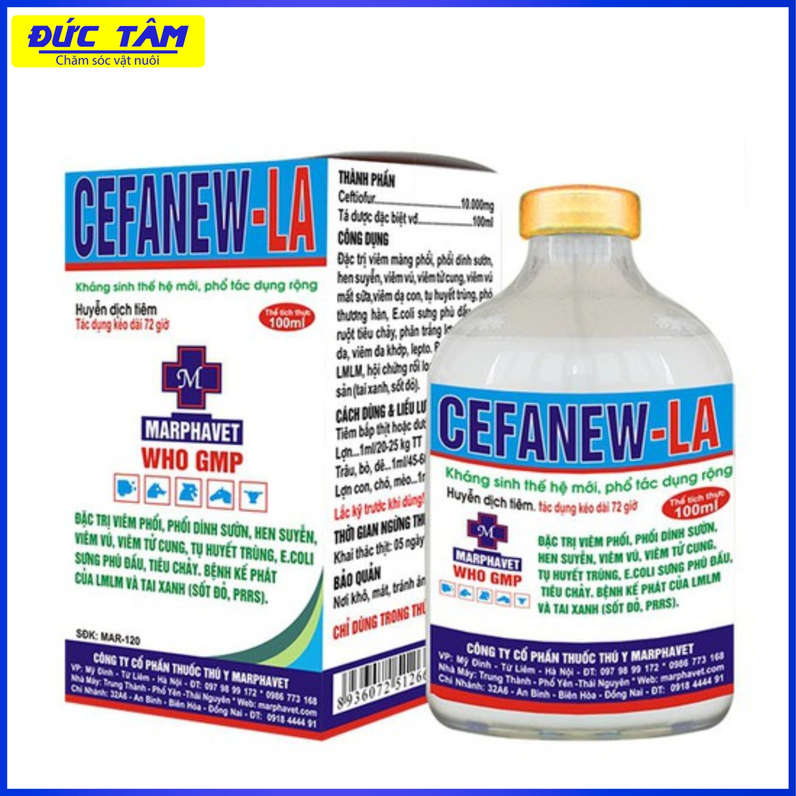 Đặc trị viêm màng phổi, phổi dính sườn, hen suyễn viêm vú, viêm tử cung MMA,viêm dạ con, Tụ huyết trùng, Phó thương hàn, E.coli sưng phù đầu, viêm ruột tiêu chảy, Phân trắng lợn con, viêm da, viêm đa khớp, Nhiễm trùng huyết, kế phát do LMLM, kế phát của hội chứng rối loạn hô hấp và sinh sản (tai xanh, sốt đỏ, prrs)… Các vi khuẩn Gram (+) và Gram (-) nhạy cảm với Ceftiofur.