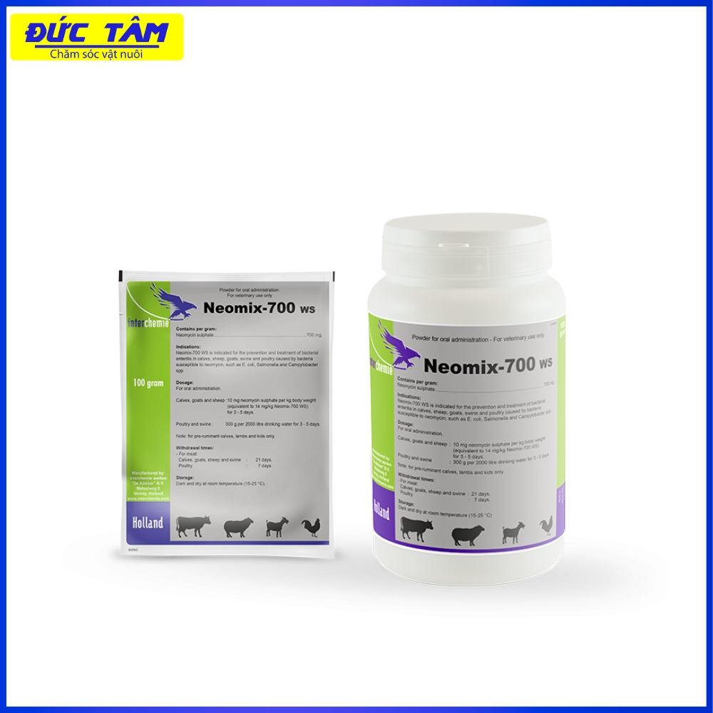 Thành phần Chứa mỗi gam: Neomycin sulphat700 mg. Tá dược ad1 g. Sự miêu tả Neomycin là một loại kháng sinh aminoglycosid diệt khuẩn phổ rộng có hoạt tính đặc biệt chống lại một số thành viên của Enterobacteriaceae, ví dụ: Escherichia coli. Phương thức hành động của nó là ở cấp độ ribosome. Khi dùng đường uống, chỉ một phần nhỏ (<5%) được hấp thu toàn thân, phần còn lại tồn tại dưới dạng hợp chất có hoạt tính trong đường tiêu hóa của động vật. Neomycin không bị bất hoạt bởi enzym hoặc thức ăn. Những đặc tính dược lý này dẫn đến việc neomycin trở thành một loại kháng sinh hiệu quả trong việc phòng ngừa và điều trị các bệnh nhiễm trùng đường ruột do vi khuẩn nhạy cảm với neomycin gây ra. chỉ định Neomix-700 WS được chỉ định để phòng ngừa và điều trị bệnh viêm ruột do vi khuẩn ở bê, cừu, dê, lợn và gia cầm gây ra bởi các vi khuẩn nhạy cảm với neomycin, chẳng hạn như E. coli, Salmonella và Campylobacter spp. Chống chỉ định Quá mẫn với neomycin. Quản lý cho động vật có chức năng thận bị suy giảm nghiêm trọng. Quản lý cho động vật với một tiêu hóa vi sinh hoạt động. Quản lý trong thời kỳ mang thai. Quản lý đối với gia cầm sản xuất trứng dùng cho người. Phản ứng phụ Các tác dụng độc hại điển hình của Neomycin (độc thận, điếc, phong tỏa thần kinh cơ) thường không được tạo ra khi dùng đường uống. Không có tác dụng phụ bổ sung nào được mong đợi khi chế độ liều lượng quy định được tuân thủ chính xác. liều lượng Dùng đường uống: Bê, dê và cừu: 10 mg neomycin sulphate/kg thể trọng (tương đương 14 mg/kg Neomix-700 WS) trong 3 - 5 ngày. Gia cầm và lợn: 300 g trên 2000 lít nước uống trong 3 - 5 ngày. Lưu ý: chỉ dành cho bê, cừu và trẻ em chưa nhai lại. thời gian rút tiền - Cho thịt: Bê, dê, cừu và lợn: 21 ngày. Gia cầm : 7 ngày.